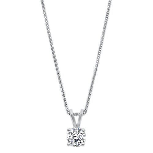 This solitaire diamond pendant features a single round brilliant 0.48ct diamond, graded by our in-house AGS and GIA-certified gemologist to have a Good cut grade, F color, and SI2 clarity, and mounted in a 14kt white gold 4-prong baseket mounting and hanging from a 14kt white gold 18-inch chain with the option to hook at 16 inches. A beautiful, timeless pendant that is eligible for our “Grow-A-Diamond” program should you choose to upgrade your diamond to a larger one int he future.