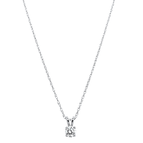 This 14kt white gold diamond solitaire pendant features a .41ctw round brilliant diamond and an 18″ rope chain. The center stone has been graded by our in house certified gemologist to have a good cut grade, K color and SI1 clarity.
