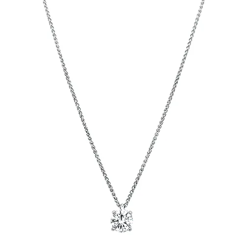 This beautiful platinum diamond solitaire necklace features a .56ctw round brilliant diamond mounted in a 4prong setting accented by a diamond belt and a 16-18″ adjustable chain. The center stone has been graded by our in house certified gemologist to have a very good cut grade, J color and SI1 clarity.