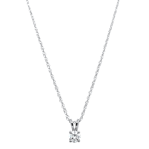 This 14kt white gold 4 prong solitaire pendant features a round brilliant diamond totaling .32ctw on a 18″ 14kt white gold rope chain. This diamond has been graded by our in house certified gemologist to have a very good cut grade, J color and SI1 clarity.