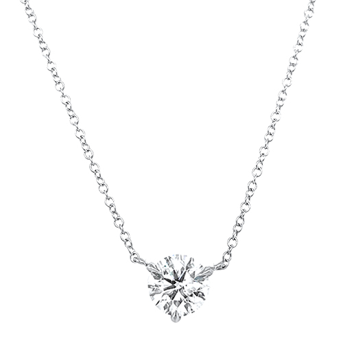 This 18kt white gold diamond solitaire necklace features a 1.50ct round diamond set in a 3 prong head with a pave diamond lobster clasp and a 16-18″ adjustable chain. The center stone has been graded by our in house certified gemologist to have M color and VS2 clarity.