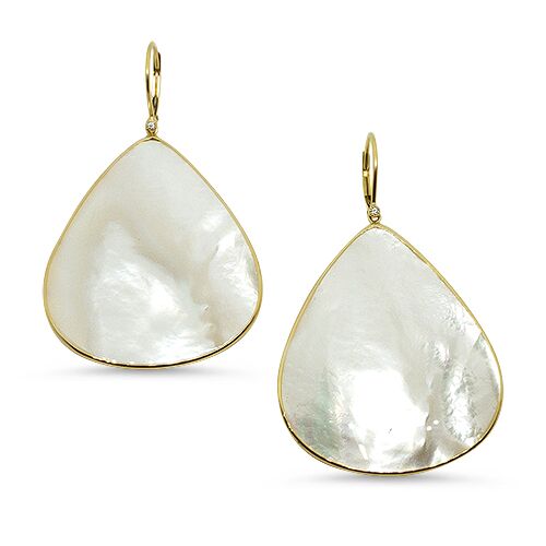 These 14 karat yellow gold earrings feature two tear-drop shaped pieces of mother of pearl (measuring 1.5 inches long) mounted in a bezel-style setting with a small diamond at the top. A gorgeous statement earring that is lightweight, yet will get plenty of complements.