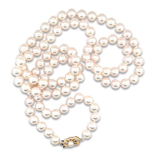 This gorgeous Akoya cultured pearl necklace features 100 stunning pearls with a 14kt yellow gold clasp and measures 36″ in length.