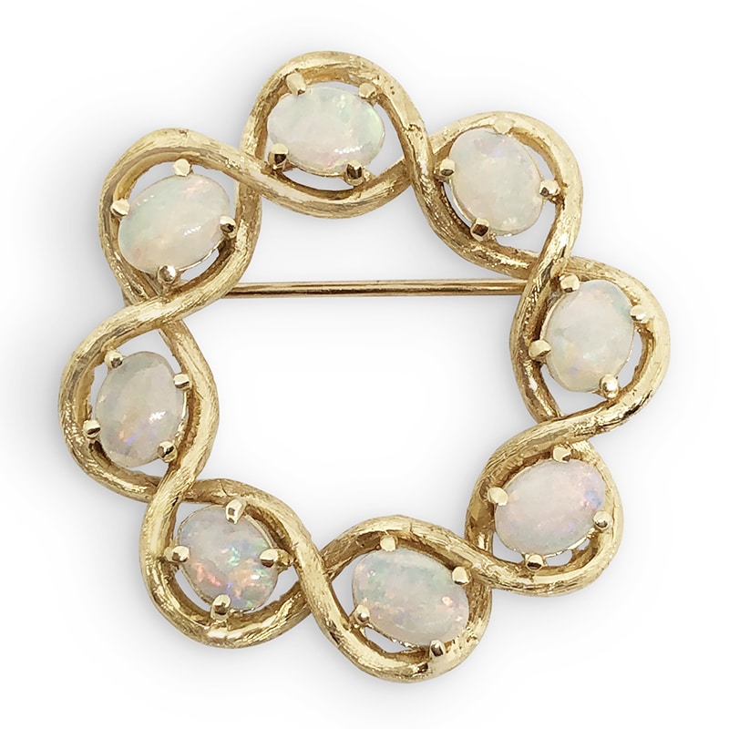 14kt. yellow gold oval opal brooch pin from our Estate collection. The 8 opals total approximately 4.00ct.t.w. This brooch is 1 1/4″” wide. New Retail Value: $1200