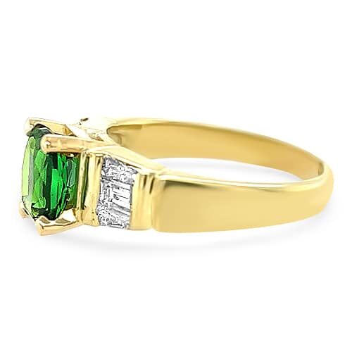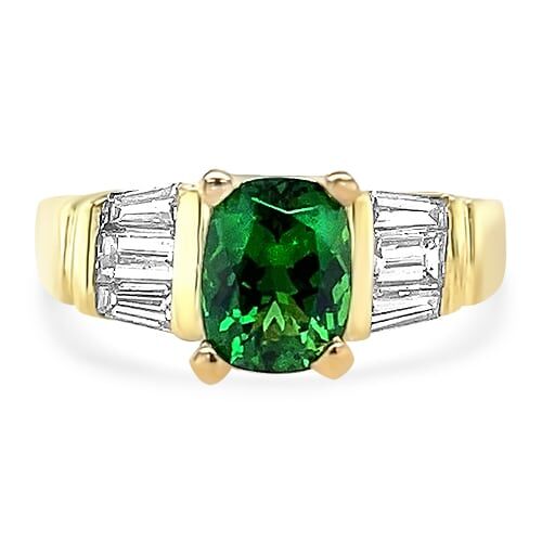 This 18kt yellow gold Estate ring features a center 1.27ct elongated cushion-cut Chrome Tourmaline with side tapered baguette and straight baguette diamonds (6 totatling approximately 0.50ctw) and is ring size 6.5.