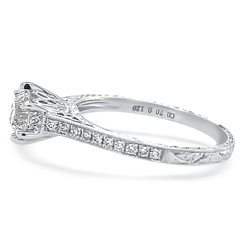 This 18kt white gold estate ring features a single 0.70ct Old European cut diamond in a 6-prong solitaire ring with a bead-set, engraved diamond shank (20 round diamonds totaling 0.13ctw) and is a ring size 6.25.