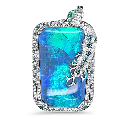 This platinum estate 20ct black boulder opal brooch features a peacock motif with approximately 2.50ctw of diamonds, 21 emeralds, 9 sapphires and a single ruby (for an eye). Measuring 1.5 inches in lenght this brooch can also be worn as a statement-making pendant.