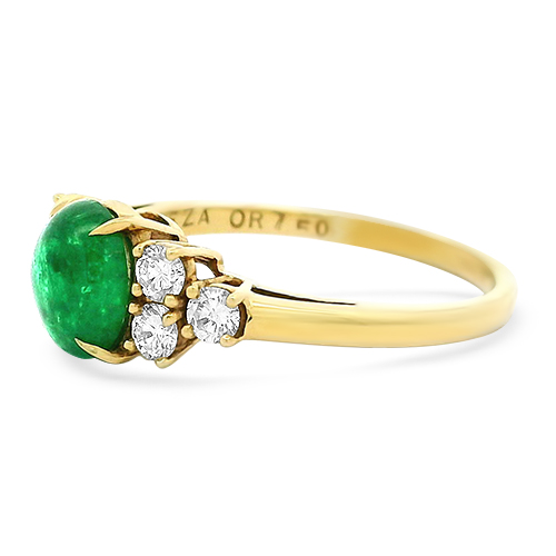 This vintage, 18kt yellow gold French ring features a 1.07ct oval cabochon emerald centrally set with three round diamonds (in a triangle shape) on either side totaling 0.36ctw and is a ring size 6.5.