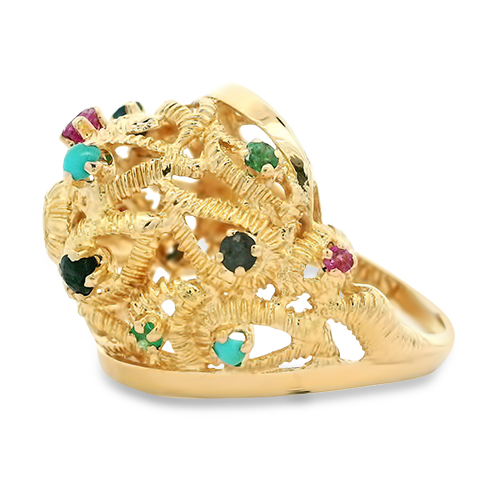 This 14kt yellow gold open dome ring features filigree cutouts accented by emerald, ruby, blue sapphire and turquoise cabochon gemstones. It is a size 7.5.
