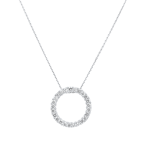 This beautiful 14kt white gold prong set diamond circle pendant features 25 round brilliant diamonds totaling approximately 1.00ctw and measures 18″ in length. Sold As Is.