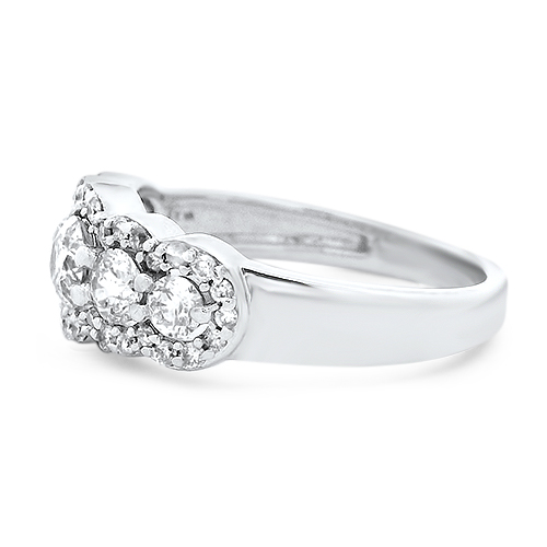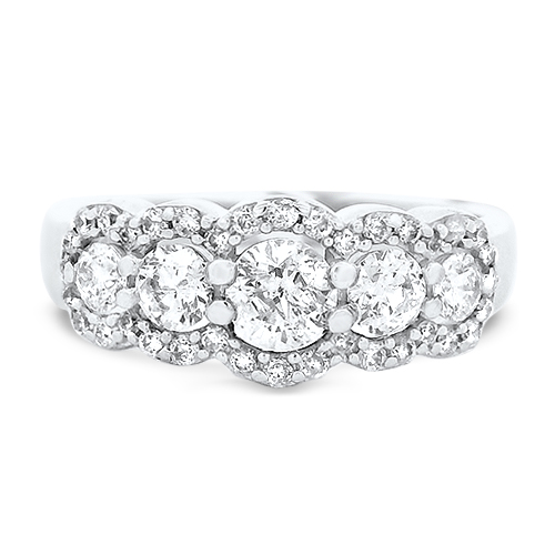 This 14kt white gold band features five graduated diamonds accented by small scalloped diamond halos totaling 2.40ctw. This ring is a size 7.
