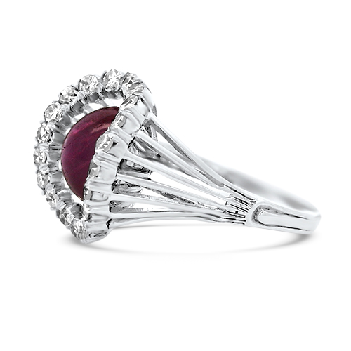 This unique sterling silver ring features a center 3ct oval star ruby accented by a concave halo of round brilliant diamonds totaling approximately .50ctw. This ring is a size 6.5.