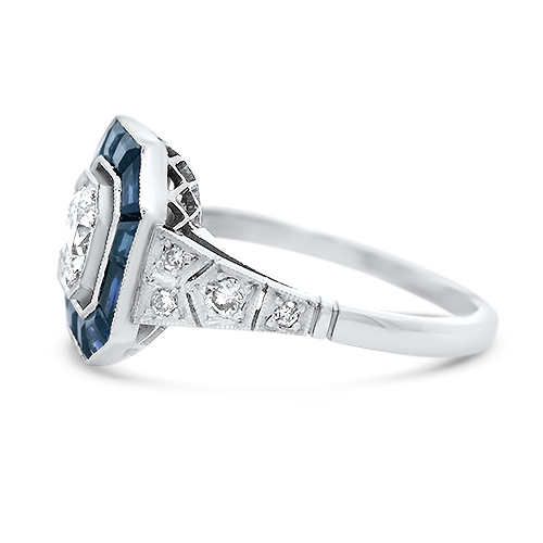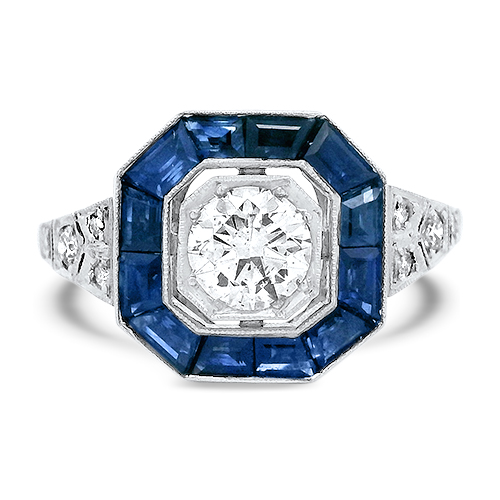 This platinum ring features a center .53ct round diamond accented by an octagonal blue sapphire halo and a tapered diamond and milgrain shank. This ring is a size 6.75.
