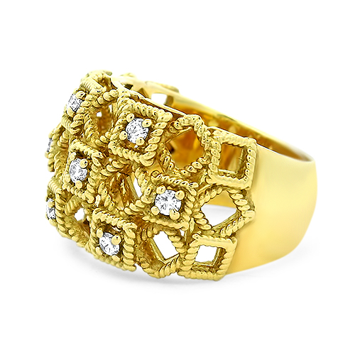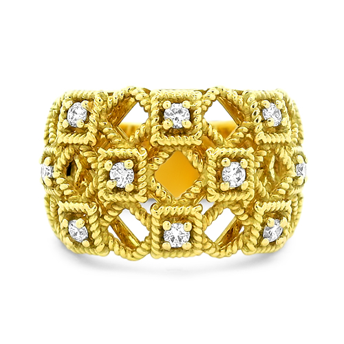 Crafted in Italian 18kt yellow gold this wide band features a open lattice design with twisted rope detail and round brilliant diamonds in 4 prong squared settings. The ring is a size 7.