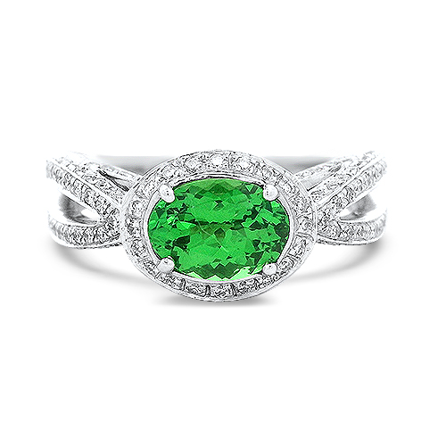 This striking 18KT white gold ring features a vivid oval tsavorite garnet set in a modern eastÂ’west orientation, creating a distinctive and contemporary look. The center stone is framed by a sparkling diamond halo, while a split diamond shank adds elegance and dimension. Completing the design, a diamond undercarriage provides hidden brilliance and fine craftsmanship. Total diamond weight is approximately .70CT, offering radiant sparkle from every angle.