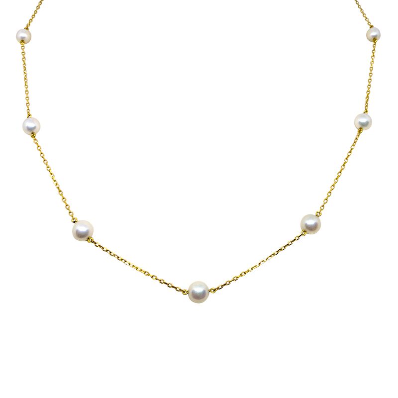 This “Pearl By The Yard” style necklace features 9 AAA Akoya pearls in graduated sizes (from 6.5mm to 4.5mm) evenly spaced along an 18kt yellow gold 18-inch chain. A more casual take on a strand of pearls, but still classy and timeless.