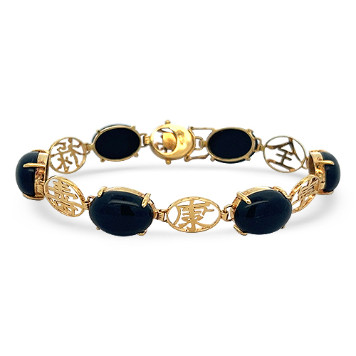 Rich in character and elegant detail, this Asian-inspired bracelet features smooth oval black onyx cabochons set in luxurious 18KT yellow gold. Each gemstone station alternates with intricately crafted gold symbols, creating a rhythmic, meaningful design with a refined cultural influence. The combination of deep black onyx and warm gold offers a striking, timeless aesthetic suitable for both everyday wear and special occasions.