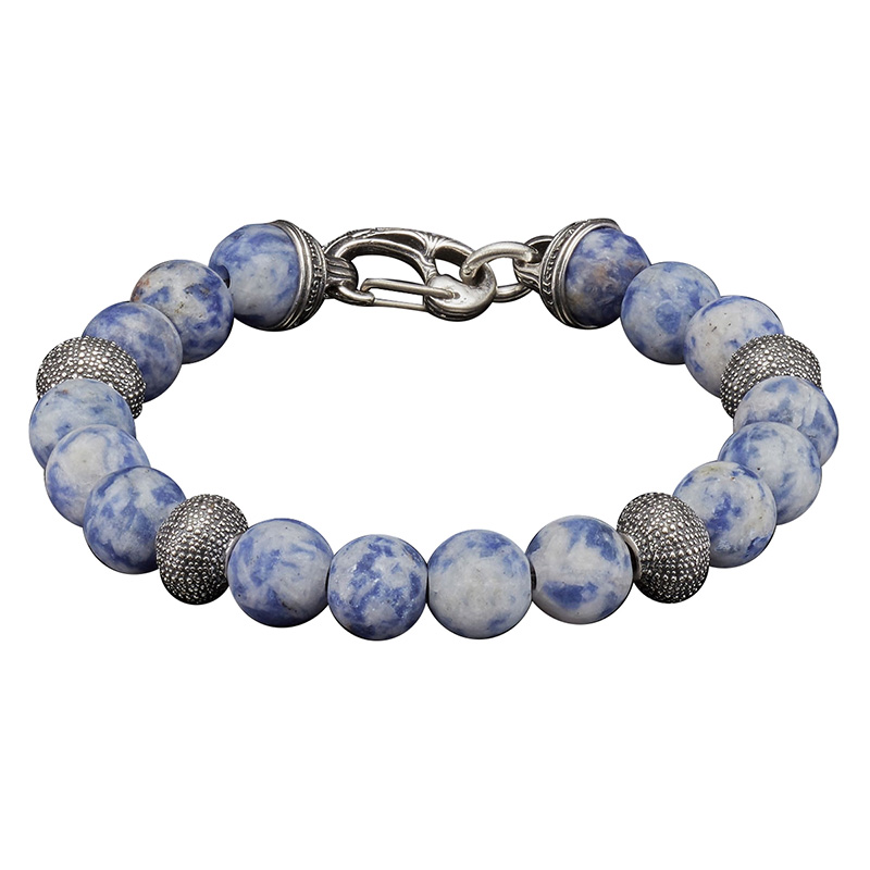 This bracelet is imbued with the remarkable energy of the northern Pacific Ocean. Darker, stormier, intense and alluring, the Beach Comber features frosted Sodalite beads that range from dark blue to grey to white, much like the breakers along our own Northwest Pacific Coast. Accent beads are sterling silver sculpted like the body of a sea urchin, elegant and understated and with a great feel in the hand or on the wrist. Clasp assembly is also sterling silver. Subtle tones and well sized for daily wear.