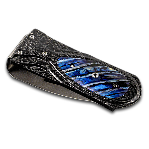 The Zurich Â’Blue WaveÂ’ is a beautiful money clip featuring a frame in hand-forged ‘Brain Wave’ damascus by Chad Nichols, inlaid with blue 10,000 year-old fossil Woolly Mammoth tooth, and white topaz gemstone. The clip is machined and polished from tempered stainless steel, with a beautiful engraving bright cut against the matte-finished background. The Â’Blue WaveÂ’ money clip is a beautiful, and functional personality statement featuring some of the unique materials and forged metals that are the hallmark of William Henry’s collections; a timeless heirloom to be proudly worn and used for a lifetime before handing it down to another generation.