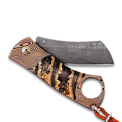The ‘Hurricane’ is truly without equal in the world of exotic cigar cutters. The thru hole in the hand-forged Mokume frame will accommodate up to a 52 gauge cigar, and the single sided precision ground damascus blade cuts cleanly thru your preferred smoke. The frame is hand-forged ‘Twist’ mokume gane by Mike Sakmar, with our stainless ‘Boomerang’ damascus blade by Chad Nichols featuring three alloys forged together into a tapestry in steel with an optimum hardness of HRC 59 for wear resistance. Inlayed fossil wooly mammoth tooth is hand-polished to fine luster, and citrinegemstones, titanium, stainless, and sterling hardware complete the presentation. This piece works beautifully as a cigar cutter and general purpose pocket knife!