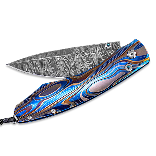 The Spearpoint ‘Blue Demon’ features a light and resilient titanium frame that is laser-engraved in color. The blade is hand-forged ‘Hornets Nest’ damascus by Mike Norris; the one-hand button lock and the thumb stud are set with London Blue topaz gemstones. A remarkable design that gives you an instrument with a full-size secure grip, and a versatile deep-belly blade, the Spearpoint epitomizes William Henry’s core philosophy ‘ that superlative function deserves to be elevated to superlative art. The ‘Blue Demon’ features the perfect balance between elegance, function, and hi-tech materials; a distinctive personality statement to be worn and used for a lifetime.